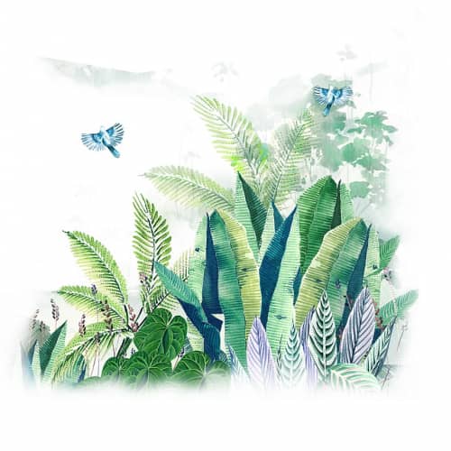 Tropikalny mural 30166 pochodzi z kolekcji Bombay niemieckiej firmy Marburg. Przedtsawia urokliwy krajobraz z rajskimi ptakami w ciepłej  tonacji zieleni i niebieskiego, który stworzy prawdziwą  oazę spokoju i stanie się  najważniejszym akcentem dekoracyjnym  w całym mieszkaniu.