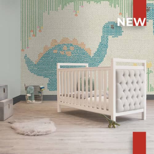 Mural do pokoików dziecięcych przedstawia dinozaura zaprojektowanego tak, że przypomina wyszywankę, haft krzyżykowy. Piękny i ponadczasowy wzór w pastelowych kolorach będzie ciakawym wykończeniem ścian w pokojacg dziecięcych.