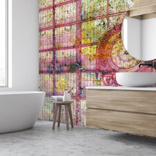 Mural w inspirujących kolorach przywołuje na myśl stylistykę vintage, retro. Fragment starego zegara na tle odrapanej poprzecieranej ściany. Piękna i ponadczasowa kompozycja doda elegancji i ciekawego charakteru wnętrzu.