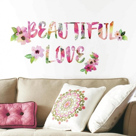 Pobierz teksturęNaklejka foliowa samoprzylepna wielokrotnego użytku, przedstawiająca kolorowe kwiaty i napis BEAUTIFUL LOVE. Dzięki zastosowaniu specjalnego kleju, odklejamy i przyklejamy ją wielokrotnie w innych miejscach, nie pozotawiając śladów na ścianie nawet po długim czasie. Nadaje się również do dekoracji mebli. Naklejka składa się z 2 arkuszy o wymiarze 21,9 cm x 92,7 cm, komplet składa się z 22 elementów.