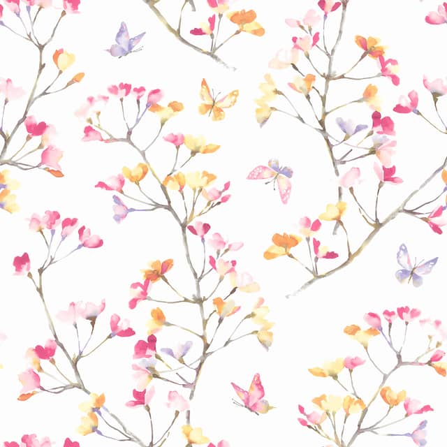 Wzór tapety z kolekcji A Perfect World autorstwa amerykańskiej firmy York Wallcoverings przedstawia subtelne akwarelowe kwiaty i motylki na białym tle. Tapeta jest idealna do pokoju dziewczynki.