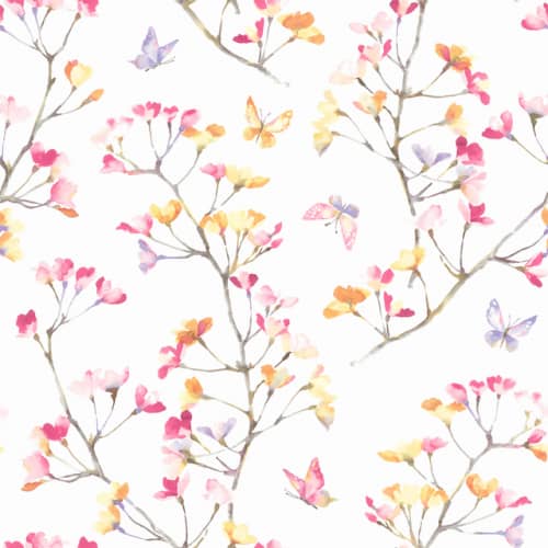 Pobierz teksturęWzór tapety z kolekcji A Perfect World autorstwa amerykańskiej firmy York Wallcoverings przedstawia subtelne akwarelowe kwiaty i motylki na białym tle. Tapeta jest idealna do pokoju dziewczynki.