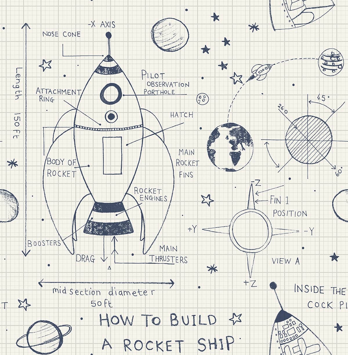 Wzór tapety z kolekcji Day Dreamers autorstwa amerykańskiej firmy Wallquest przedstawia szkic kreślarski rakiety kosmicznej. Tapeta jest idealna do pokoju chłopca.