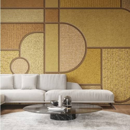 Geometryczny wzór w złocisto żółtych odcieniach  inspirowany modernizmem. Taki mural będzie piękna ozdobą nowoczesnych wnętrz. Idealnie skomponuje się z najmodniejszymi dodatkami.
