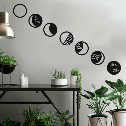 Kompozycja naklejek dekoracyjnych RoomMates autorstwa amerykańskiej firmy York Wallcoverings przedstawia wzór faz księżyca, który idealnie sprawdzi się do sporządzania notatek kredą lub markerem kredowym. Wzór świetnie sprawdzi się do pokoju młodzieżowego. Wyróżnia się łatwością instalacji i demontażu bez śladów po kleju i uszkodzeń powierzchni, niezobowiązywaniem się oraz wszechstronnością w użyciu. Dzięki nowoczesnej technologii Peel & Stick może być wykorzystywana wielokrotnie. Stanowi ciekawy sposób na ożywienie lub odmianę każdej przestrzeni lub powierzchni, bądź to ściana, mebel czy sprzęt elektroniczny.