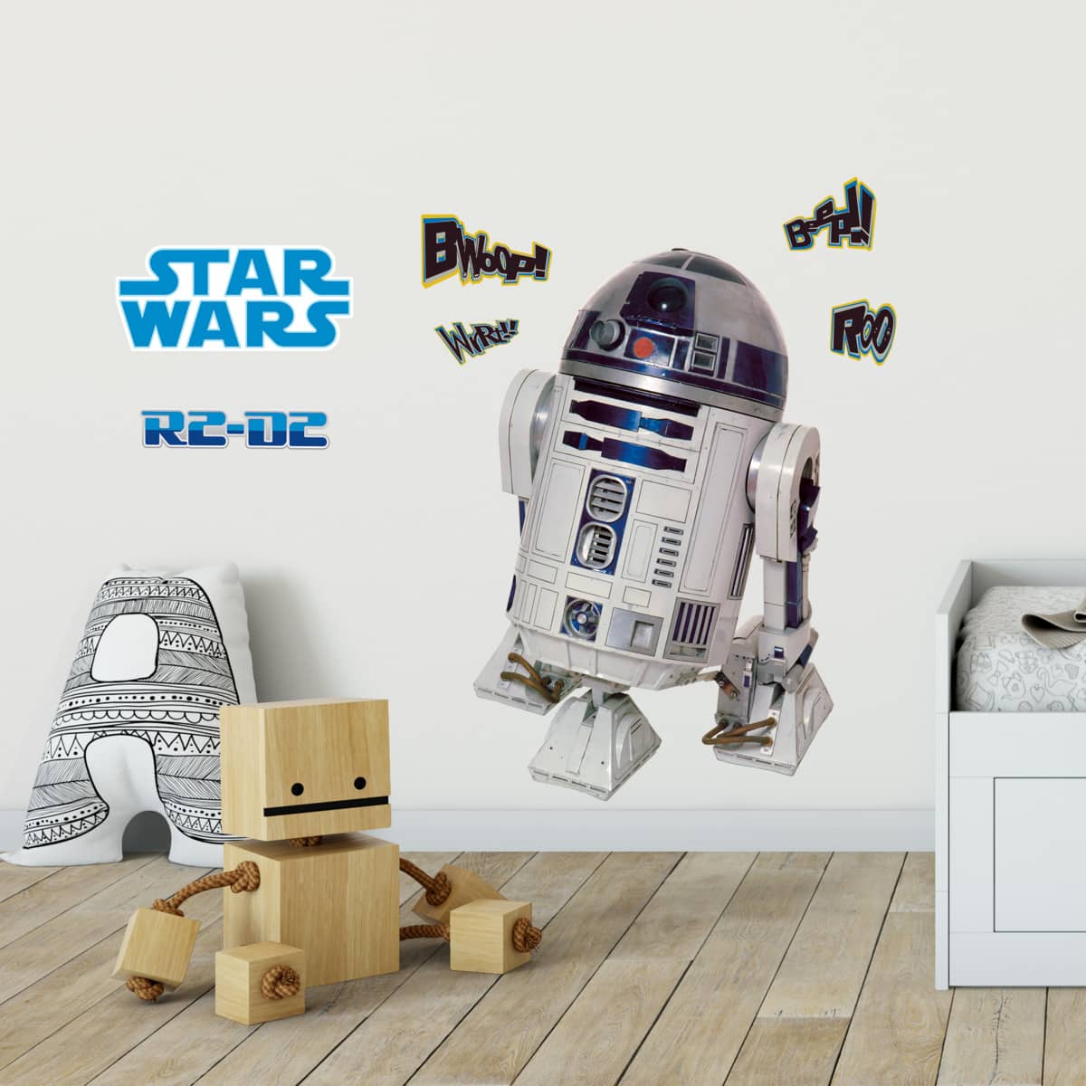 Kompozycja naklejek dekoracyjnych RoomMates autorstwa amerykańskiej firmy York Wallcoverings przedstawia bohatera serii Star Wars kultowego R2-D2. Wzór idealny do pokoju małego dziecka i fana serii, naklejka doda niepowtarzalnego klimatu do wnętrza. Wyróżnia się łatwością instalacji i demontażu bez śladów po kleju i uszkodzeń powierzchni, niezobowiązywaniem się oraz wszechstronnością w użyciu. Dzięki nowoczesnej technologii Peel & Stick może być wykorzystywana wielokrotnie. Stanowi ciekawy sposób na ożywienie lub odmianę każdej przestrzeni lub powierzchni, bądź to ściana, mebel czy sprzęt elektroniczny.