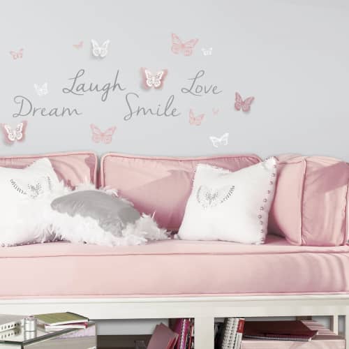 Naklejka foliowa samoprzylepna wielokrotnego użytku, przedstawiająca motywujący napis, ozdobiony motylkami 3D. Dzięki zastosowaniu specjalnego kleju, odklejamy i przyklejamy ją wielokrotnie w innych miejscach, nie pozotawiając śladów na ścianie nawet po długim czasie. Nadaje się również do dekoracji mebli. Naklejka składa się z 2 arkuszy o wymiarze 25,4 cm x 45,7 cm, komplet składa się z 21 elementów.