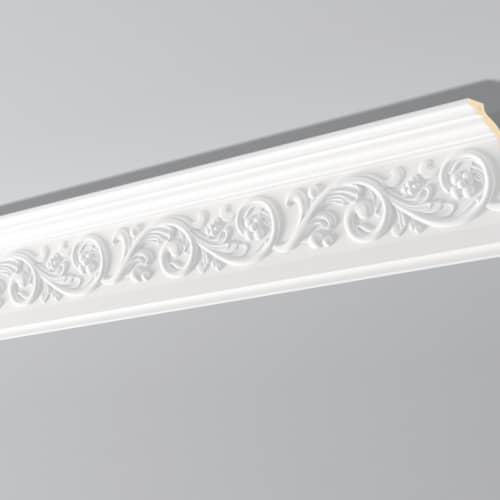 Pobierz teksturęListwa wykonana z wysokiej gęstości poliuretanu. Powierzchnia listwy gładka, przygotowana do malowania. Produkt jest lekki, odporny na wodę i wilgoć. Listwa w stylu klasycznym, bogato zdobiona.