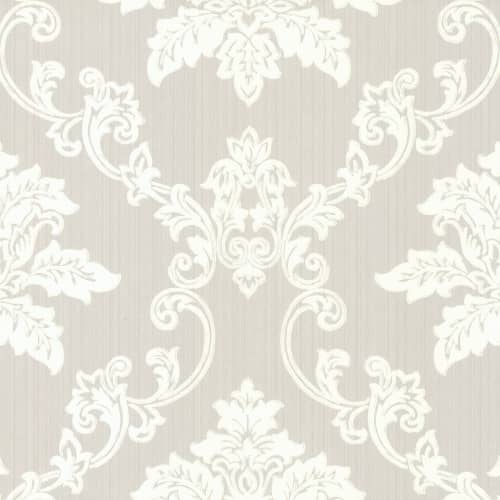 Luksusowa tapeta z kolekcji Rosemore produkcji angielskiej firmy 1838 Wallcoverings jest to współczesna odsłona klasycznego adamaszkowego wzoru. Kremowy motyw został wydrukowany na tle w odcieniach szarości. Harmonijne połączenie subtelnych kolorów stanowi podstawę eleganckiego wnętrza.