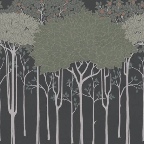 Border przedstawiający panoramę drzew wyprodukowany na metalizowanej połyskujacej powierzchni. Pochodzi z kolekcji Arts & Crafts. Produkt ten będzie świetnym elementem każdej aranżacji wnętrza.