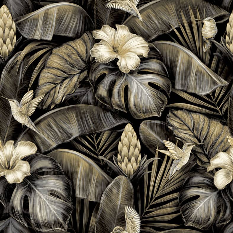 Hipnotyzujący wzór przedstawiający bujne tropikalne liście wśró których fruwają kolorowe kolibry. Piękny i ponadczasowy produkt. Dzięki tej tapecie każde wnętrze będzie wyjątkowe i niepowtarzalne.