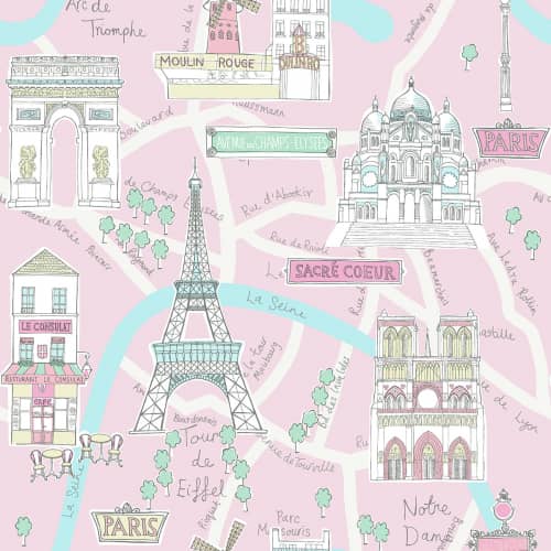 Na tapecie znajdują się zabytki Paryża, wieża Eiffla, katedra Notre Dame, łuk Triumfalny pomiędzy którymi rozrysowana jest siatka ulic miasta. Delikatne, pastelowe kolory podkreslą charakter pokoju młodej damy.