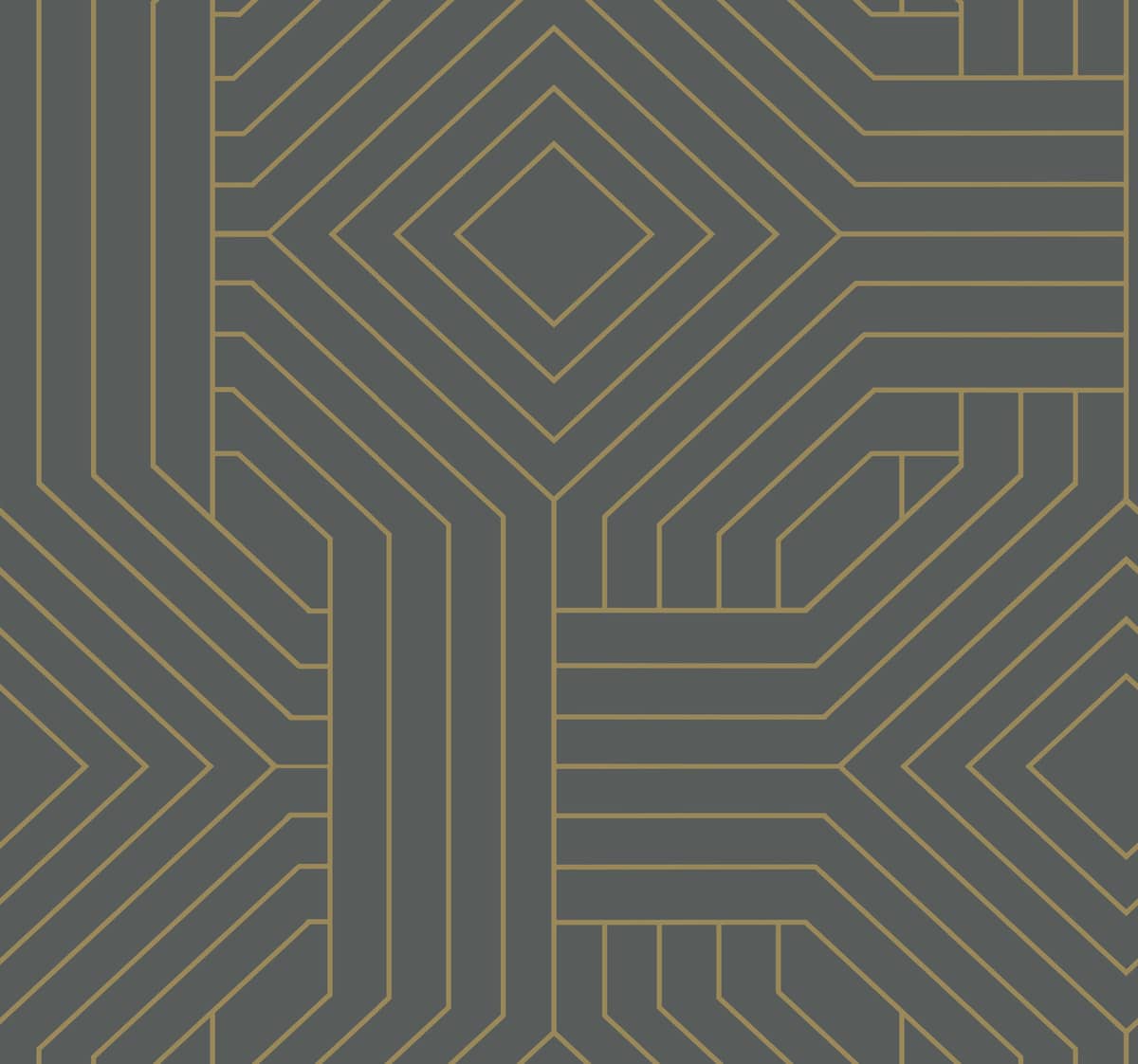 Geometryczny motyw tapety w ciemno szarym odcieniu z połyskującym złotym wzorem. Produkt pochodzi z kolekcji Modern Artisan firmy York Wallcoverings autorstwa znanej amerykańskiej projektantki Candice Olson. Tapeta tworzy nowoczesny labirynt. Graficzny charakter wzoru będzie się ciekawie prezentował na ścianie. Tapeta wniesie do wnętrza elegancję i ponadczasowy styl.