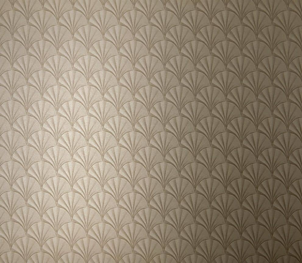Stylowe piękno, wzór tapety z kolekcji Elodie firmy 1838 Wallcoverings został zaprojektowany w odcieniach brązu, zachodzące na siebie kółka przypominają łuski syreny. Połysk tworzy przyjemny efekt na ścianie. Tapeta stanowi ciekawy sposób na uzupełnienie aranżacji wnętrza, wypełniając je pięknymi kolorami.