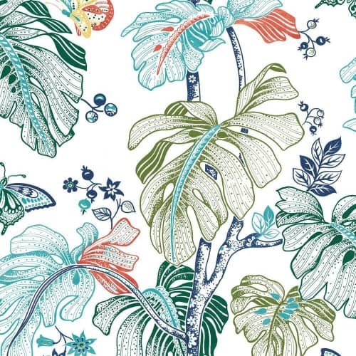 Przedstawia motyw kolorowych tropikalnych liści na białym tle, które będą ożywiać każde wnętrze.