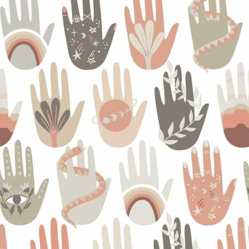 Przedstawia kolorowe dłonie pokryte różnymi motywami takimi jak tęcza, liście, kwiaty.
