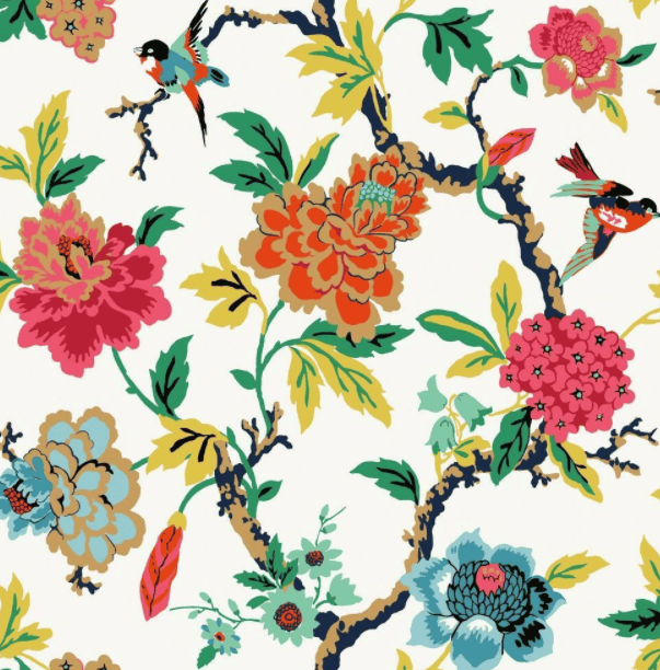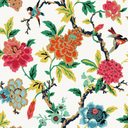 Przedstawia motyw kolorowych orientalnych drzew, kwiatów i małych ptaszków.