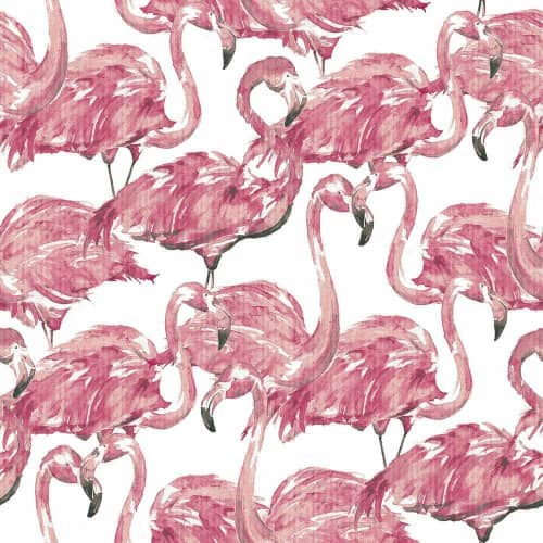 Przedstawia tropikalny wzór w różowe flamingi na białym tle.