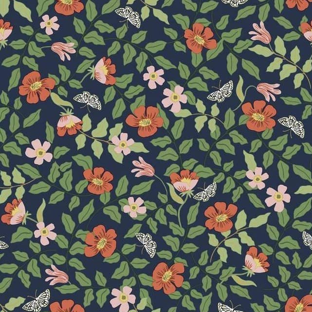 Wzór przedstawia fruwające motyle i kolorowe kwiaty otoczone delikatnymi winoroślami