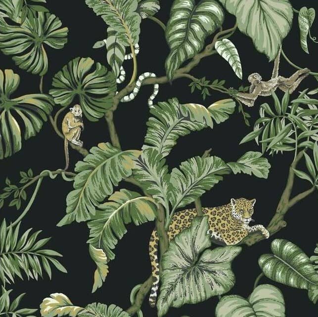 Pobierz teksturęTropikalna tapeta o wzorze liści i dzikich zwierząt amerykańskiej marki York Wallcoverings.