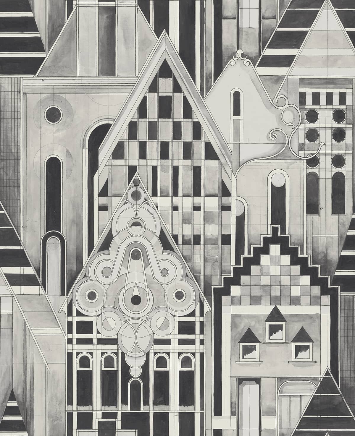 Orginalna tapeta z amerykańskiej kolekcji Skyline przedstawia gęsto skupione budynki ze spadzistymi dachami, imitując miejską zabudowę. Odcienie srebra i szarości w połączeniu z grafitem, gładkie tło, wyrazisty wzór. Okładzina idealnie ożywi nowoczesny salon. Cała kolekcja nawiązuje do wielkomiejskiego stylu i jest inspirowana klimatem  Nowego Jorku. Dominuje tu nowoczesna prostota widoczna w motywach geometrycznych, imitacji betonu czy eklektycznych wzorach kwiatowych. Z kolorów przeważa szarość z bielą i czernią, niebieski czy brąz, miejscami z odrobiną połysku. Okładziny idealne dla miłośników stonowanej, nowoczesnej elegancji i miejskich aranżacji.