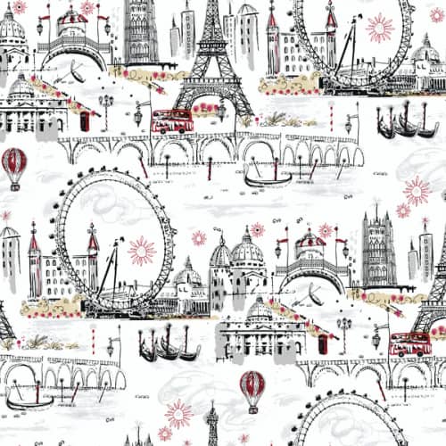 Wyjątkowa tapeta z kolekcji A Perfect World autorstwa amerykańskiej firmy York Wallcoverings inspirowana podróżą po Europie. Londyńskie Oko, wieża Eiffla, weneckie gondole i inne zabytki - jest to piękne zaproszenie do podziwiania naszego ekscytującego świata.