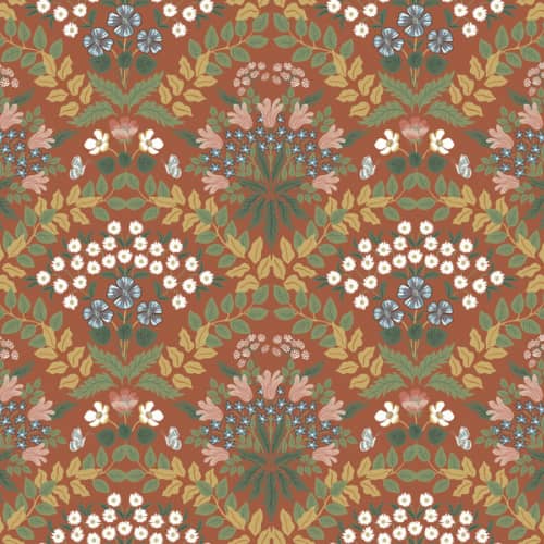 Gęsty gobelinowy wzór przedstawiający kwiaty układające się w szerokie rozłożyste wachlarze. Tapeta zaprojektowana przez znakomitą i cenioną  ilustratorkę Annę Bond załozycielkę marki RIFLE PAPER CO, która w kolaboracji z amerykańskim producentem York Wallcoverings stworzyła piękną kolekcję tapet. Nasycone głębokie barwy. Piękny wzór przedstawiający roślinność. Klasa i ponadczasowa elegancja.