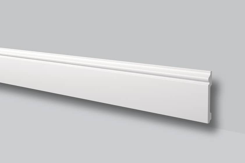 Pobierz teksturęListwa przypodłogowa wykonana z wysokiej gęstości polistyrenu. Powłoka gładka z farbą podkładową, przygotowana do malowania. Listwa jest lekka, twarda, odporna na wodę i wilgoć, odporna na zmywanie, niepalna oraz nietoksyczna. Listwa w nowoczesnym stylu.