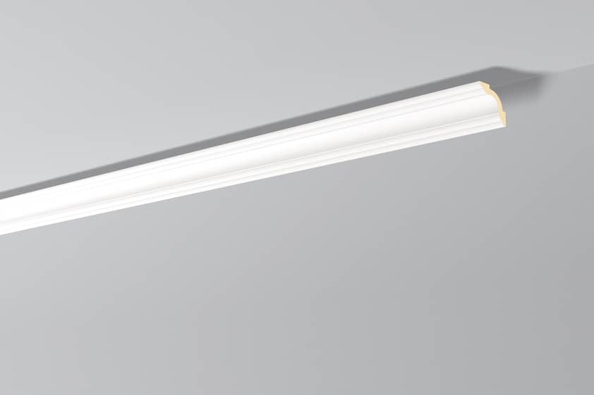 Listwa wykonana z wysokiej gęstości poliuretanu. Powierzchnia listwy gładka, przygotowana do malowania. Produkt jest lekki, odporny na wodę i wilgoć. Listwa w stylu klasycznym.