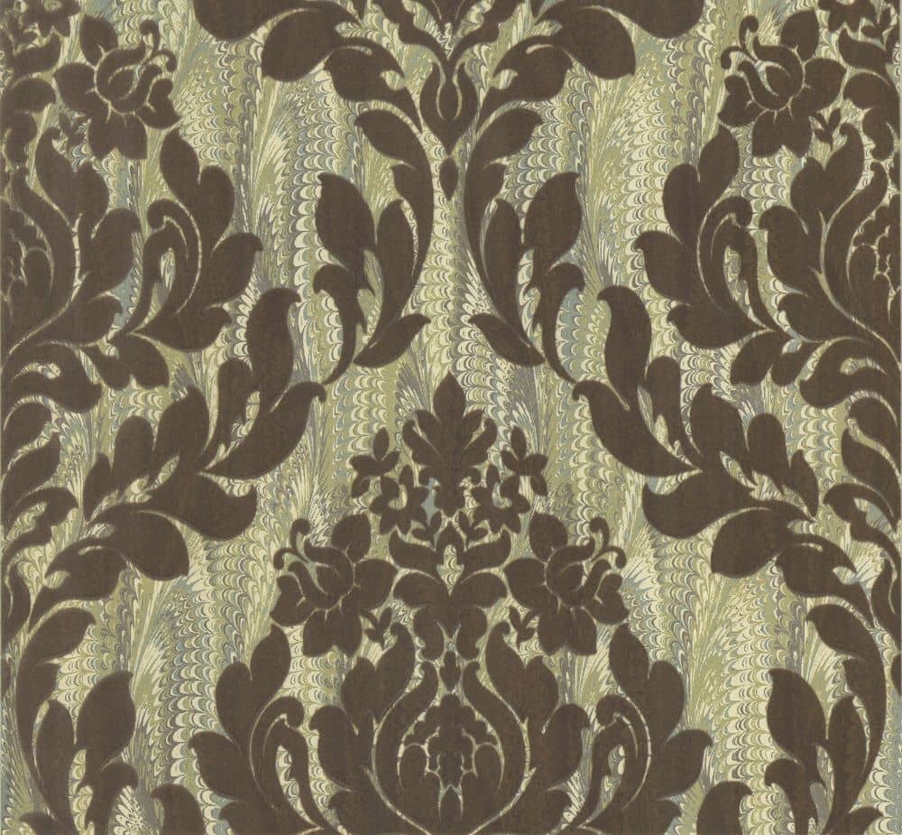 Pobierz teksturęWyjątkowa tapeta o zróżnicowanej strukturze jest to perełka w kolekcji Avington angielskiej firmy 1838 Wallcoverings. Brązowy welurowy wzór na gładkim błyszczącym zielono-perłowym tle inspirowany adamaszkowym motywem. Tapeta jest przyjemna w dotyku. Nada wnętrzu blasku i luksusu.