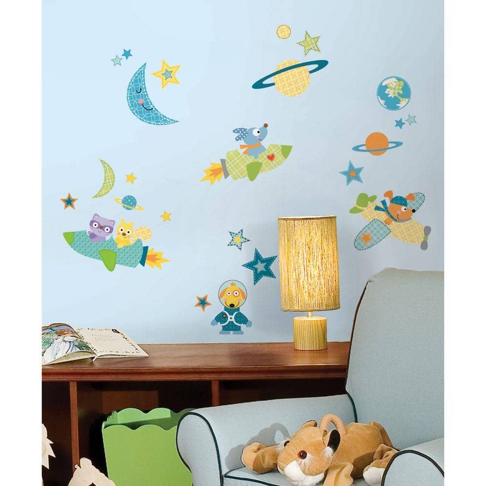 Naklejka  foliowa samoprzylepna wielokrotnego użytku przedstwiająca kolorowe rakiety kosmiczne. Dzięki zastosowaniu specjalnego kleju, odklejamy i przyklejamy ją wielokrotnie w innych miejscach, nie pozotawiając śladów na ścianie nawet po długim czasie. Nadaje się również do dekoracji mebli. Naklejka składa się z 4 arkuszy o wymiarze 25,4 cm x 45,7 cm, komplet składa się z 51 elementów.