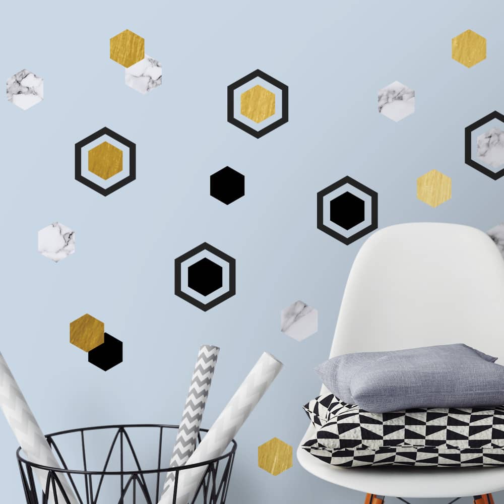 Pobierz teksturęNaklejka foliowa samoprzylepna wielokrotnego użytku, przedstawiająca złoto czarne HEXAGONY. Dzięki zastosowaniu specjalnego kleju, odklejamy i przyklejamy ją wielokrotnie w innych miejscach, nie pozotawiając śladów na ścianie nawet po długim czasie. Nadaje się również do dekoracji mebli. Naklejka składa się z 3 arkuszy o wymiarze 22,9 cm x 44,1 cm, komplet składa się z 29 elementów.
