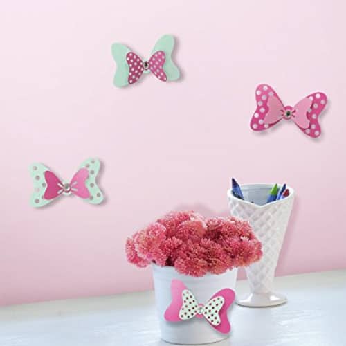 Naklejka MINNIE MOUSE amerykańskiej firmy York z kolekcji Disney. Efekt 3D. Odstające "muchy" z kryształkiem. Naklejka składa się 1 arkusza a na nim dwa elementy o wymiarze 8,9 cm x 5,6cm każdy.
