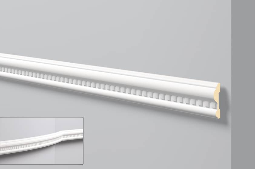 Pobierz teksturęListwa przyścienna wykonana z wysokiej gęstości Poliuretanu. Powłoka gładka przygotowana do malowania. Jest lekka, twarda, odporna na wodę i wilgoć, odporna na zmywanie, niepalna oraz nietoksyczna. Można malować wszystkimi farbami lateksowymi, emulsyjnymi, akrylowymi, metalicznymi na bazie wody. Listwa w klasycznym stylu, bogato zdobiona.
