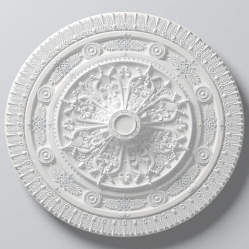 Rozeta ARSTYL jest wykonana z twardego poliuretanu o wysokiej gęstości. Powłoka jest gładka pomalowana białą farbą podkładową, przygotowana do malowania. Rozeta jest lekka, wytrzymała, odporna na wodę i wilgoć. Można malować wszystkimi farbami emulsyjnymi, akrylowymi, metalicznymi na bazie wody.