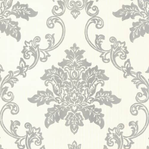 Luksusowa tapeta z kolekcji Rosemore produkcji angielskiej firmy 1838 Wallcoverings jest to współczesna odsłona klasycznego adamaszkowego wzoru. Delikatnie lśniący motyw w kolorze srebra został wydrukowany na matowym tle w odcieniach kremu. Harmonijne połączenie subtelnego tła i metalicznej powierzchni stanowi podstawę eleganckiego wnętrza.