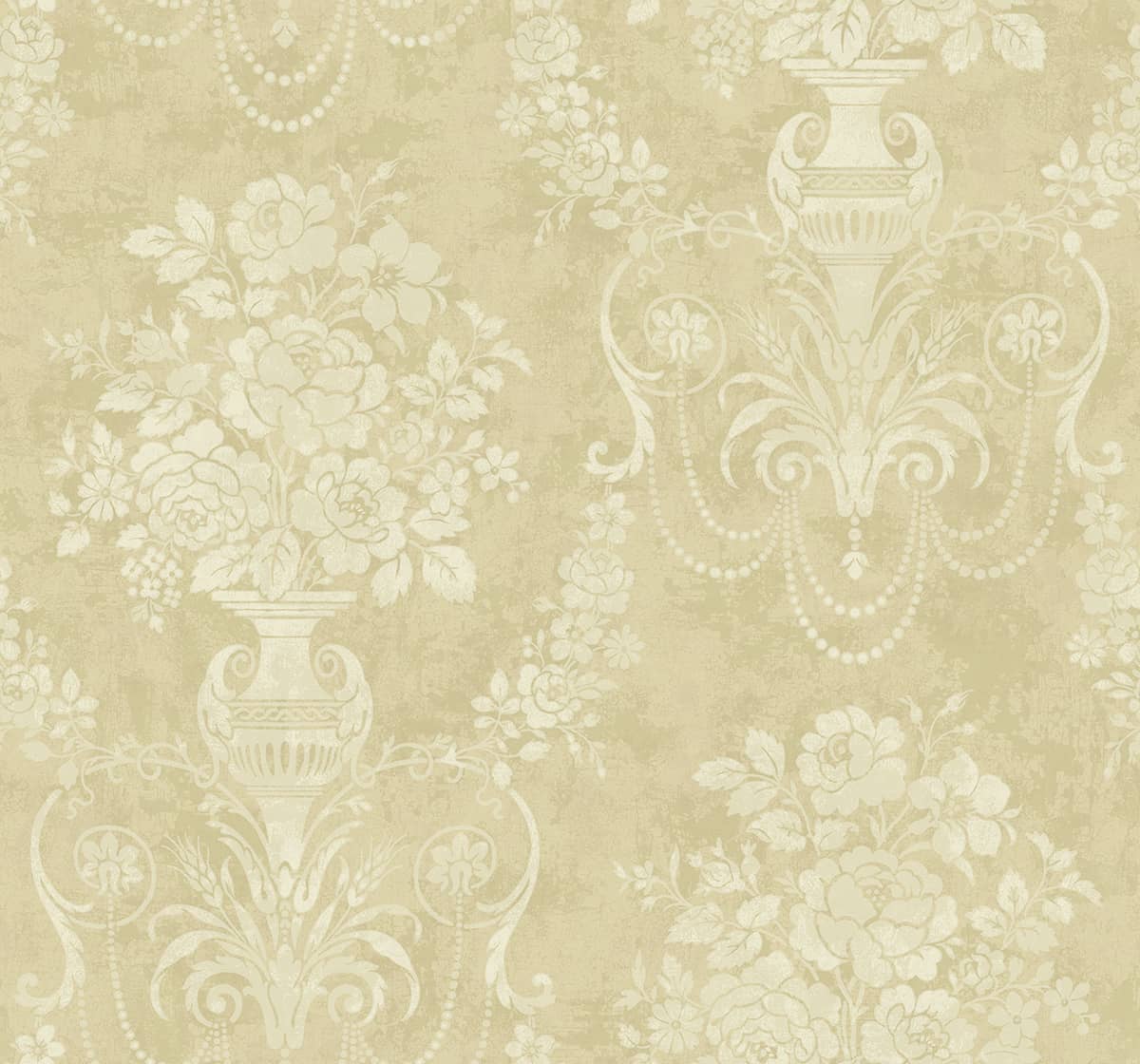 Tapeta KENTON CR30505 w klasycznym stylu ozdobiona bukietami kwiatów i girlandami, przepięknie mieniąca się w świetle. Posiada wyczuwalny w dotyku wzór, który został naniesiony na przetarte tło.