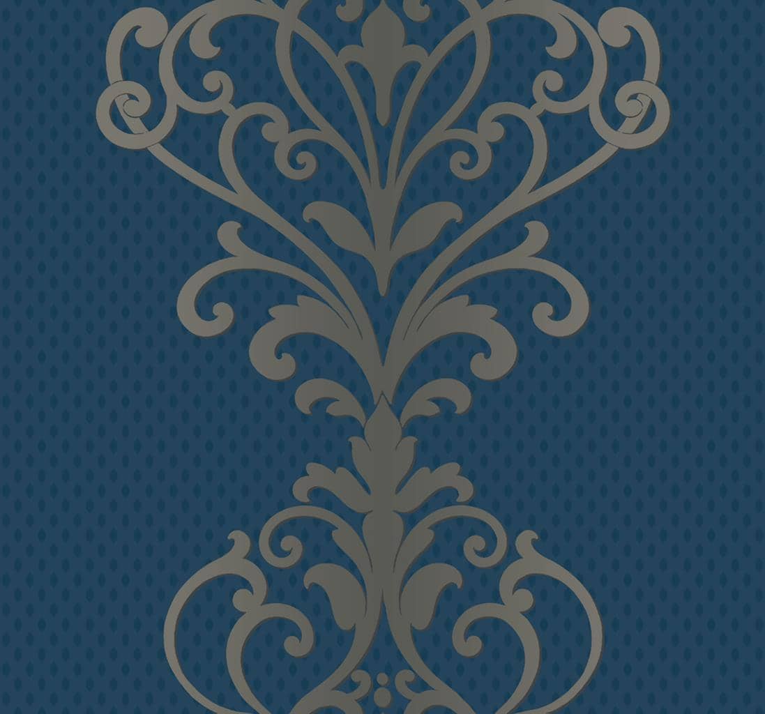 Niezwykła tapeta GE10902 z kolekcji Deco amerykańskiej marki Collins&Company przedstawia układającyy się w pasy,  srebrny wzór w stylu damask na granatowym tle.  W całej kolekcji znajdziemy wzory geometryczne, duże liście czy stylizowaną koniczynę marokańską. Sporo w tej kolekcji połysku i różnorodności faktur.  Złoto, szarość granat , turkus czy fiolet – kolory żywe i dynamiczne,  doskonale oddają ducha tych okładzin.  Kolekcja idealnie wpasuje się do nowoczesnej i eleganckiej stylistyki wnętrza.