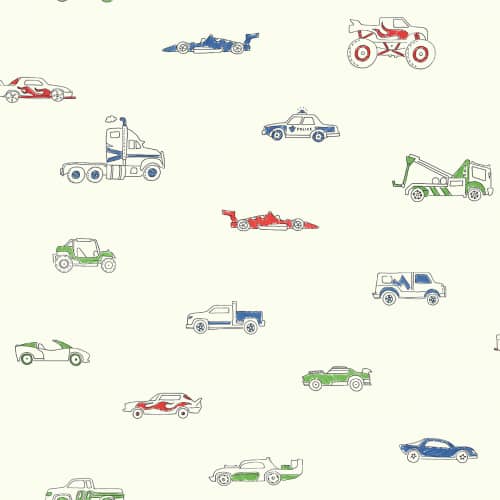 Tapeta do pokoju dziecięcego w delikatny wzór samochodów.