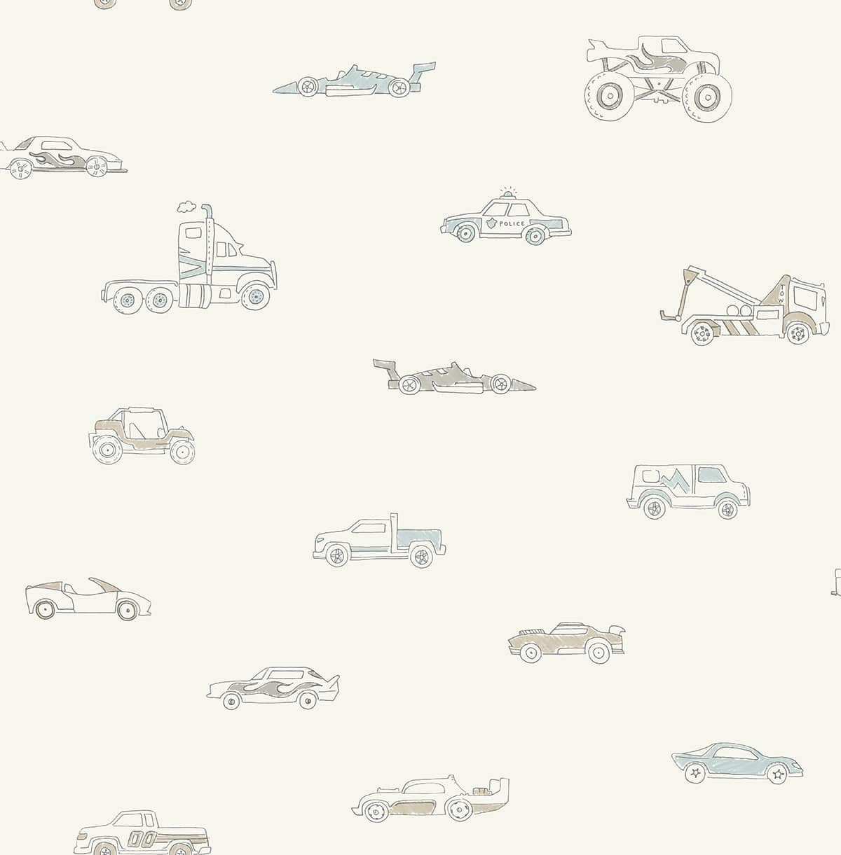 Tapeta do pokoju dziecięcego w delikatny wzór samochodów.