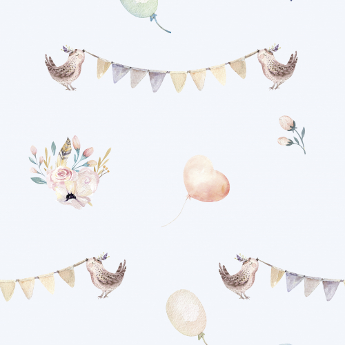 Akwarelowe girlandy z balonami i ptakami w ciekawy sposób wypełnią ścianę w pokoju dziecka. Dodadzą wnętrzu lekkości oraz nastroją pozytywnie malucha.  Produkt ten świetnie będzie się komponował z borderem z podobnym wzorem.
