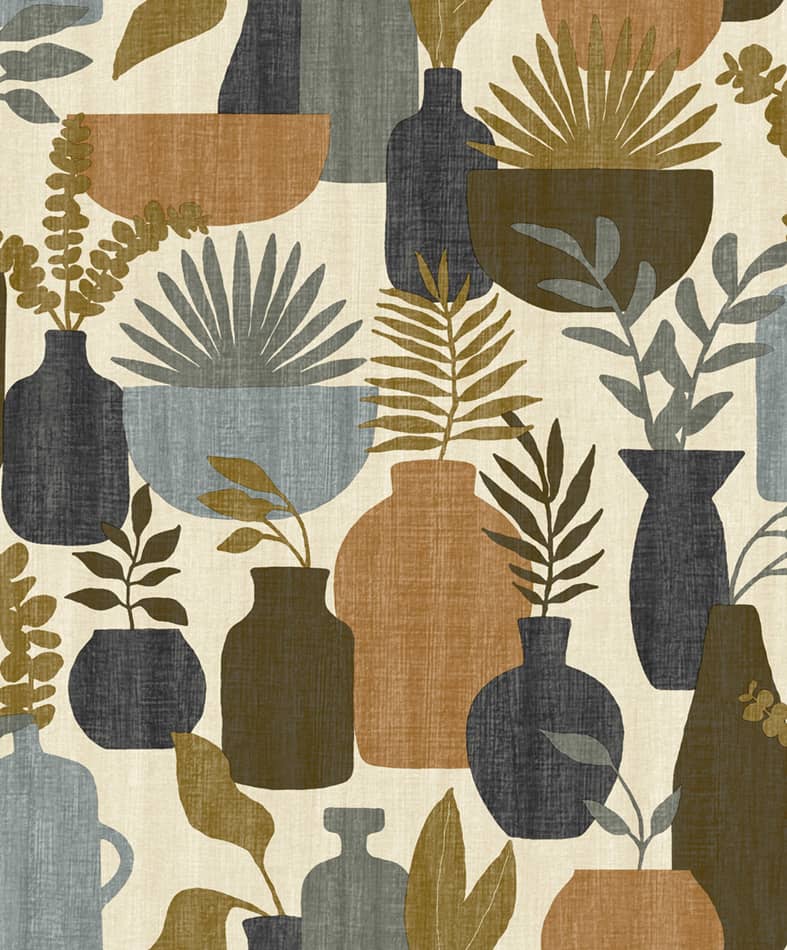 Pobierz teksturęTapeta o wzorze kolorowych wazonów, które przeplatają się listkami tworząc