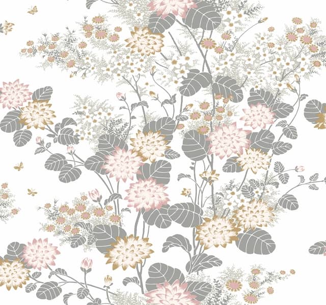 Tapeta pochodzi z kolekcji Florence Broadhurs amerykańskiej marki York. Wzór zaprojektowany przez legendarną projektantkę będzie eleganckim i pomysłowym wykończeniem przestrzeni. Tapeta przedstawia delikatne wijąca się gałązki na których kwitna kwiaty dookoła nich znajduja sie motyle. Piekna propozycja do wnętrze w stylu romantycznym. Ta tapeta sprawi że każde wnętrze będzie wyjątkowe i niepowtarzalne.
