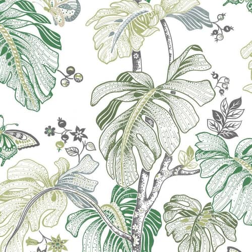 Przedstawia motyw zielonych tropikalnych liści na białym tle, które będą ożywiać każde wnętrze.