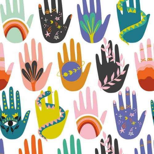 Przedstawia kolorowe dłonie pokryte różnymi motywami takimi jak tęcza, liście, kwiaty.