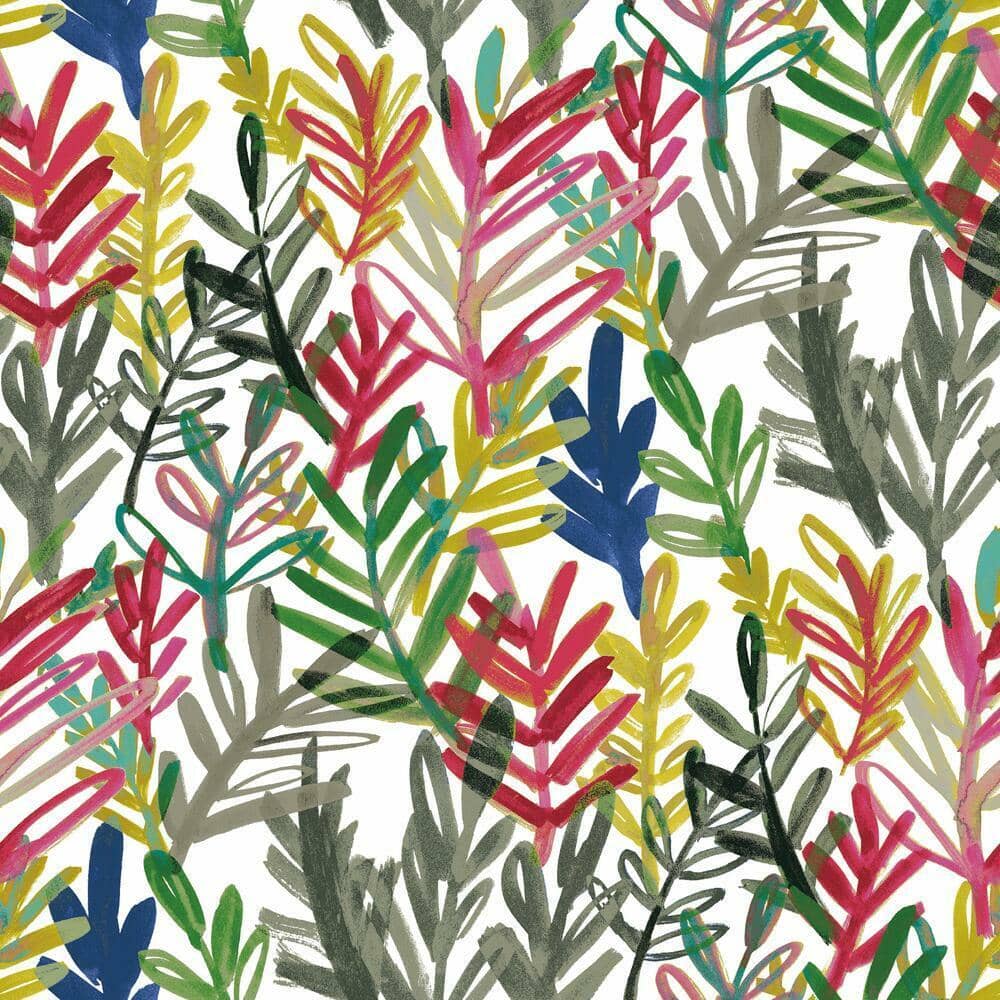 Przedstawia tropikalny wzór w kolorowe listki wyglądające jak namalowane pędzlem.