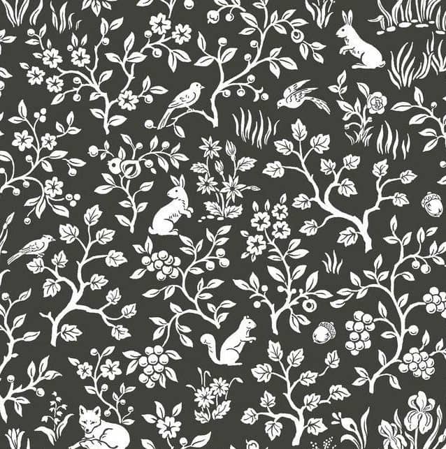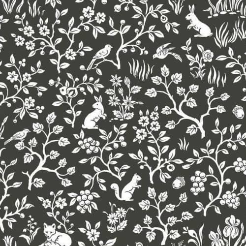 nazwa: Tapeta samoprzylepna York RIFLE PAPER CO. PSW1164RL króliczki / leśne zwierzątka / drzewa na czarnym tle