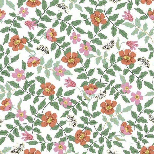 Wzór przedstawia fruwające motyle i kolorowe kwiaty otoczone delikatnymi winoroślami