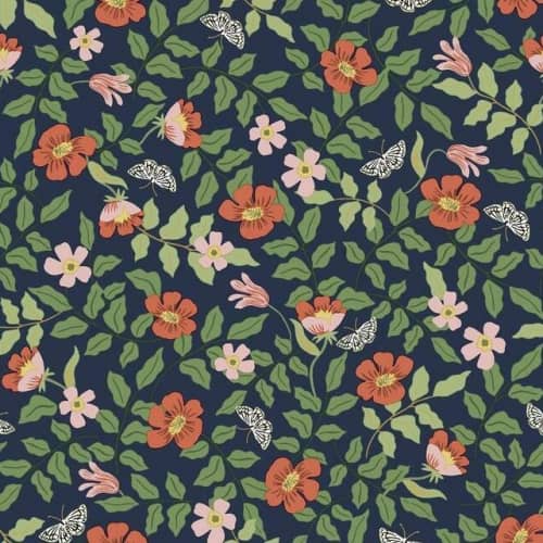 Wzór przedstawia fruwające motyle i kolorowe kwiaty otoczone delikatnymi winoroślami