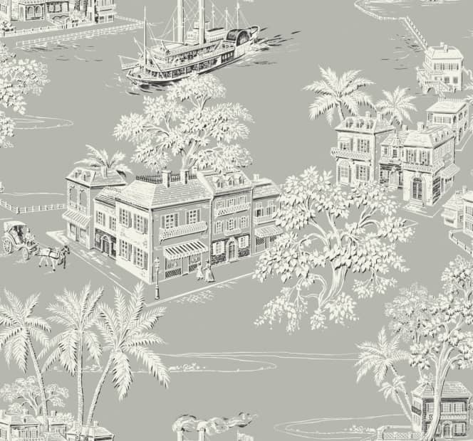 Piękna, szara tapeta z motywem amerykańskiego miasta z przełomu XIX i XX wieku idelanie wpisuje się w klimat kolekcji Charleston, która jest inspirowana stylem brytyjskich koloni. Tapeta sprawdzi się  salonie czy sypialni. Tradycja i stylistyka angielskch dworów została przeniesiona na amerykańskie południe i wzbogacona jego gorącym klimatem. Są tu piękne kwiaty w żywych barwach, geometria charakteryzująca lata 20 i pałacowe wzory damask, tak lubiane pośród angielskiej klasy średniej. Są też spokojniejsze cieniowania, motywy tkanin i imitacje marmuru. Różnorodność tej kolekcji daje bardzo duże możliwości aranżacyjne i dostarczy Państwu inspiracji w tworzeniu niepowtarzalnych wnętrz.